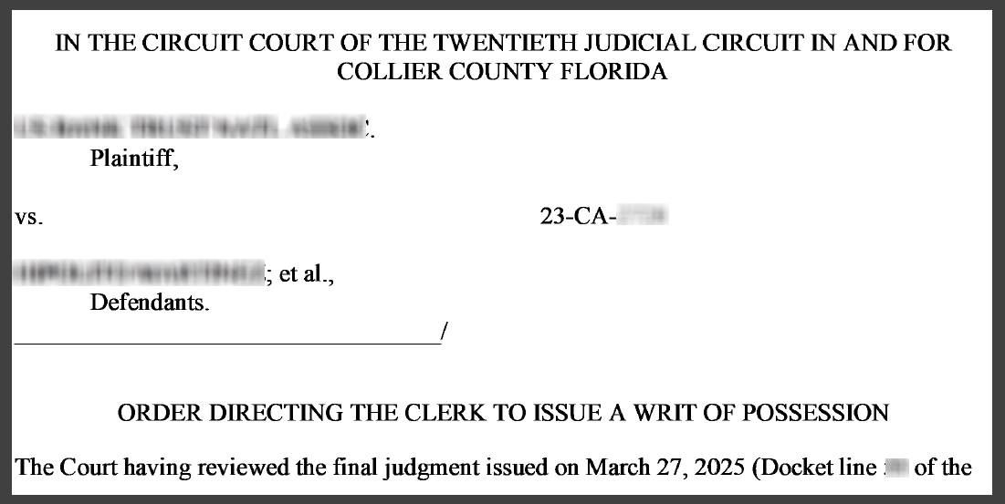 Congratulations on your successful bid. Now you need a writ of possession. I can work on getting you a writ of possession in the existing mortgage foreclosure case. Questions I will ask: Was the house occupied by the previous owner who was foreclosed on, or by a tenant? If by a tenant, Florida Statutes 83.561 requires notice to the tenant. After giving the required notice, I will file a motion and request the judge sign an order directing the Clerk of Court to issue a writ of possession in your favor. I can get started on the same day you contact me.